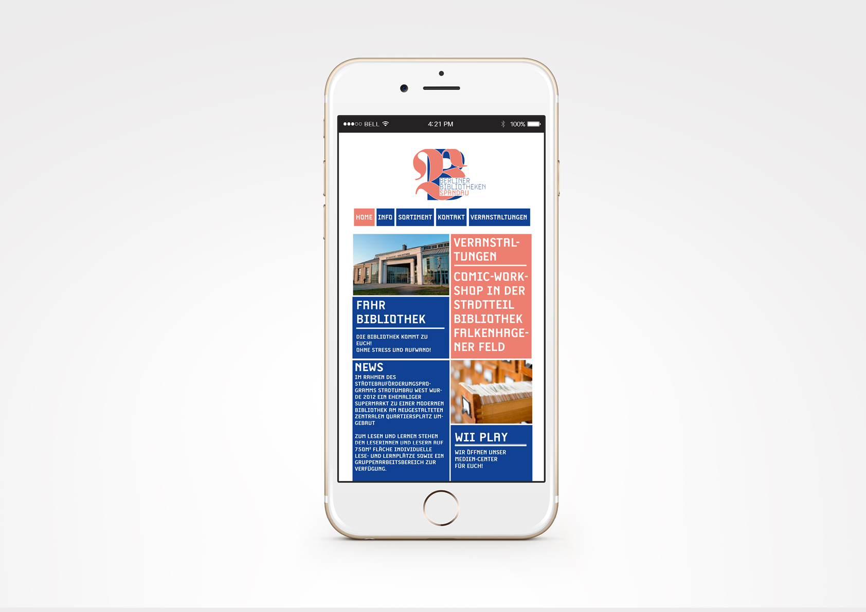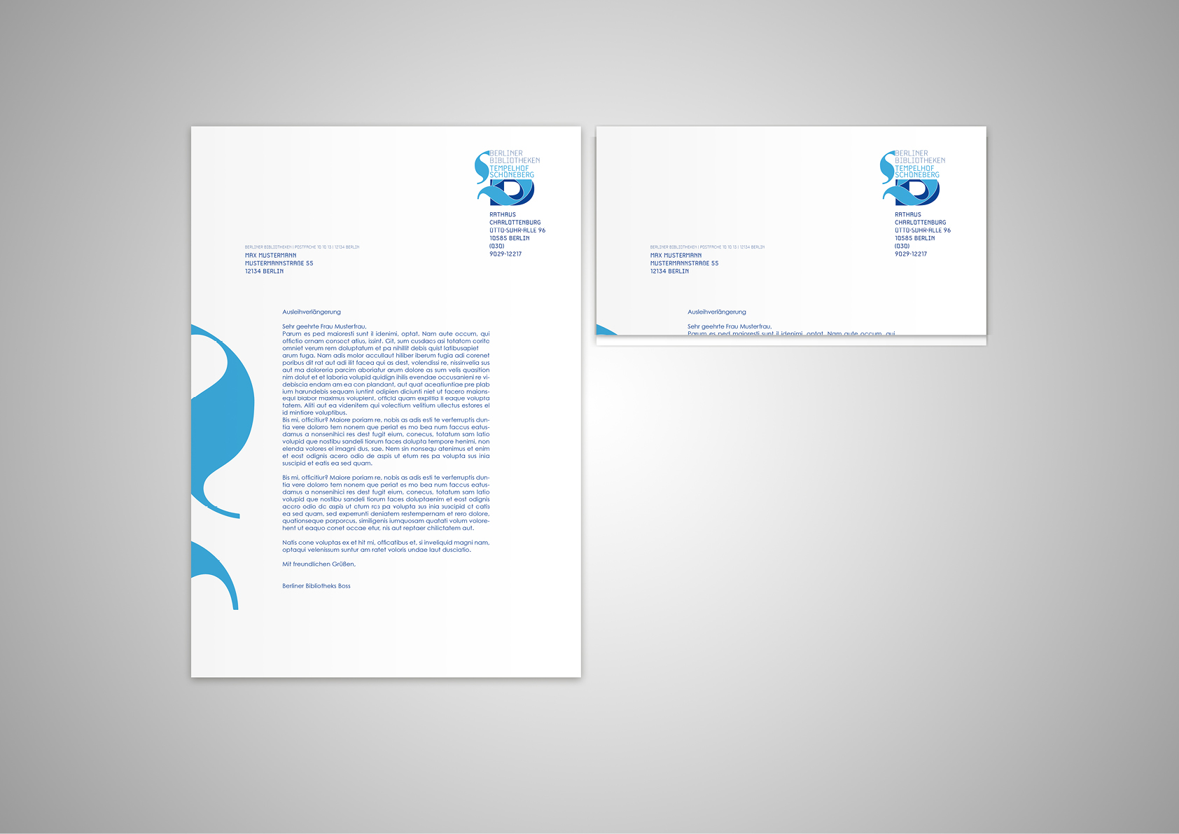 Anwendungsbeispiele: Bibliotheksausweis, Flyer, ein Briefbogen, eine Postkarte, der responsive Webauftritt sowie das Logo an der Häuserwand der Bibliothek in Spandau.